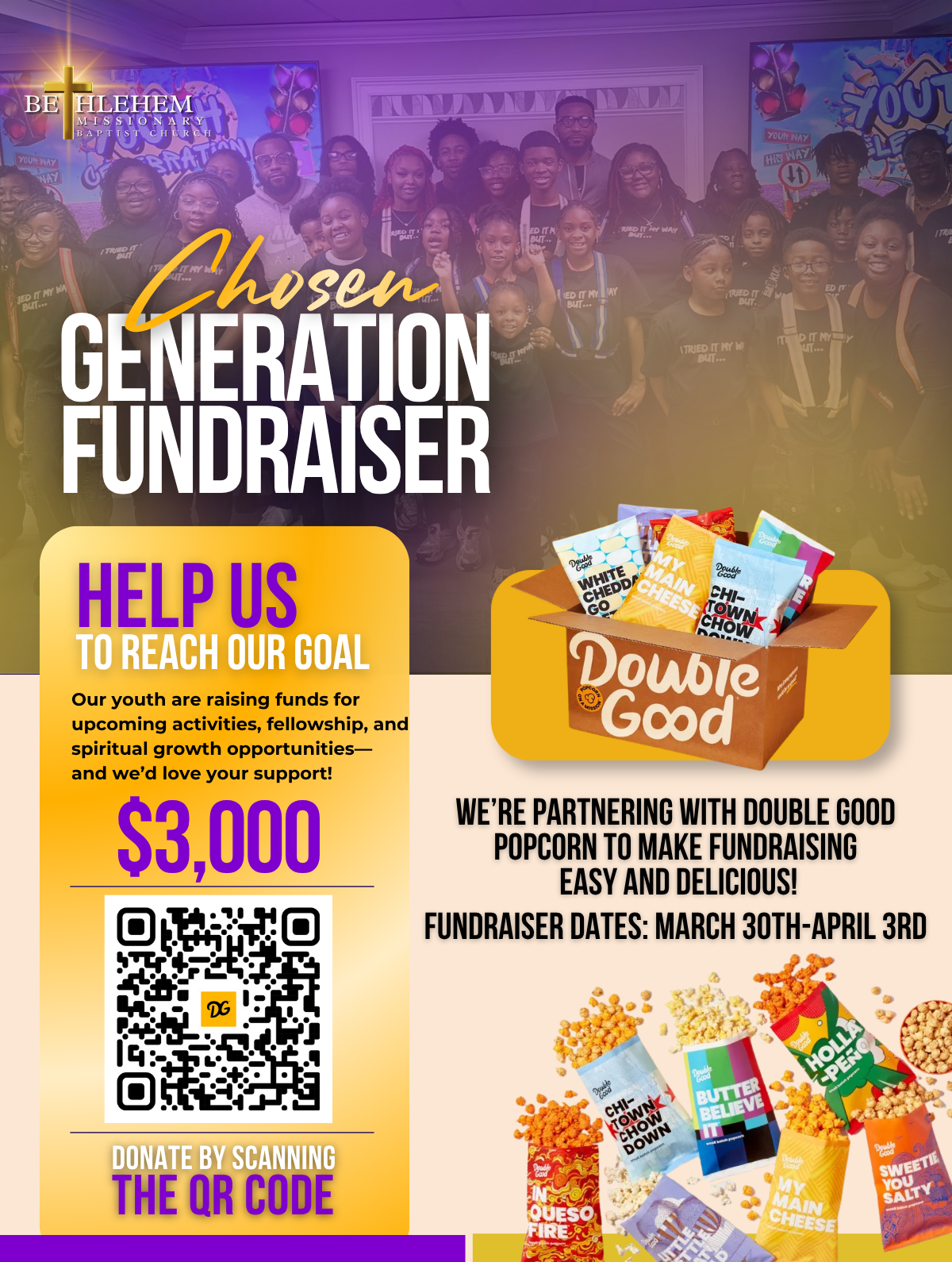 Chosen Generation Fundraiser Monday, March 30, 2026 6:00 PM Friday, April 3, 2026 7:00 PM Google Calendar ICS If you would like to donate to the youth and not buy popcorn you can send a donation via one of our other Giving Methods under the Giving Page. Please specific it’s for the Youth Department
